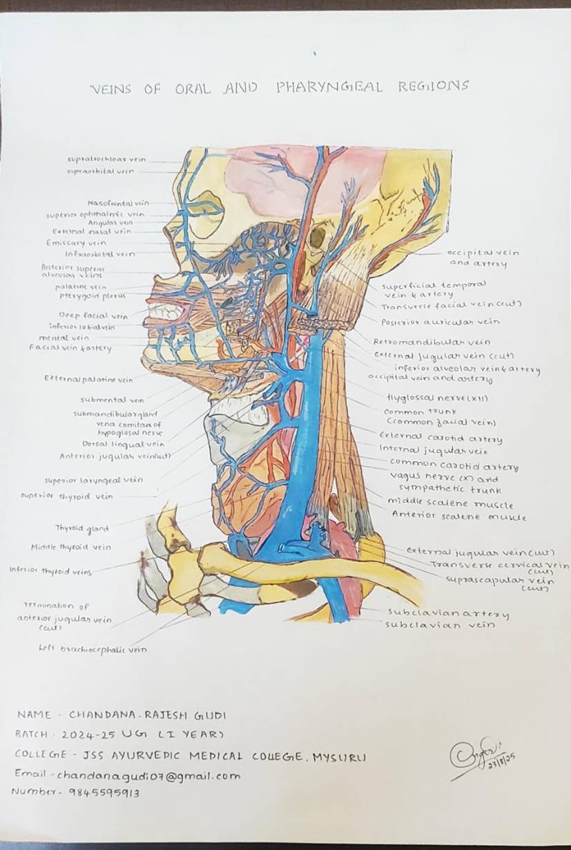 In commemoration with 110th Jayanti celebrations of His Holiness Jagadguru Rajagurutilaka Dr. Sri Shivarathri Rajendra Mahaswamiji, Dept of Rachana Sharira had conducted a drawing competition for the students of 1st year B.A.M.S on the theme of HUMAN ANATOMY on 13-09-2025. 13 students participated in the competition. Department faculty Dr Alka JK, Professor and H.O.D, Dr Chaitra S, Associate Professor and Dr Sruthi S, Assistant Professor co-ordinated and guided the students.